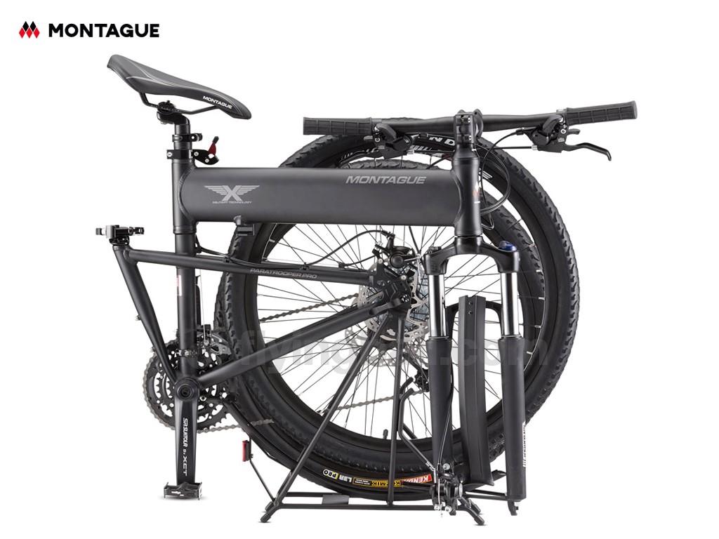 The Paratrooper Pro is a folding mountain bike that builds on Montague's classic military model with upgraded components. Tackle the toughest terrain with 27 speeds and 100mm of suspension travel or utilize the fork lockout and versatile tire tread for hard packed trails and the occasional paved road. The included RackStand acts as a cargo rack, kickstand, folded bike stand, and features a built in mud guard.