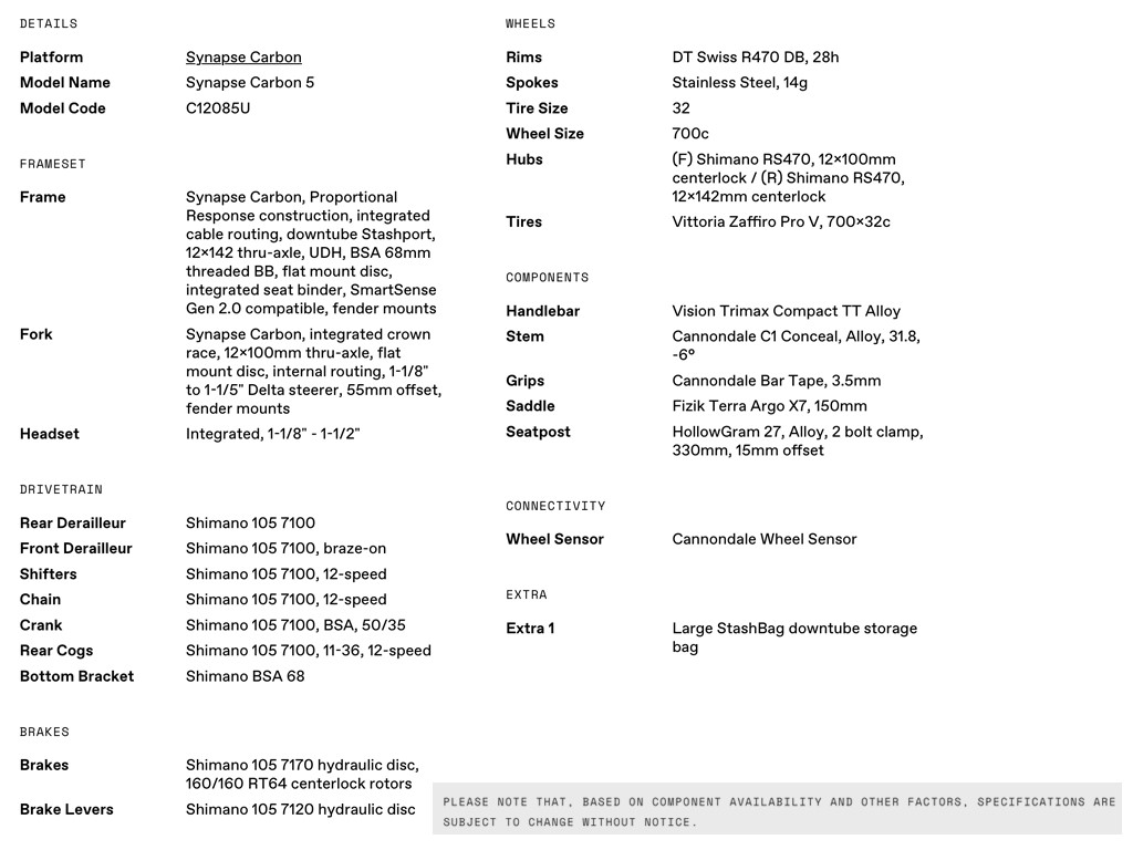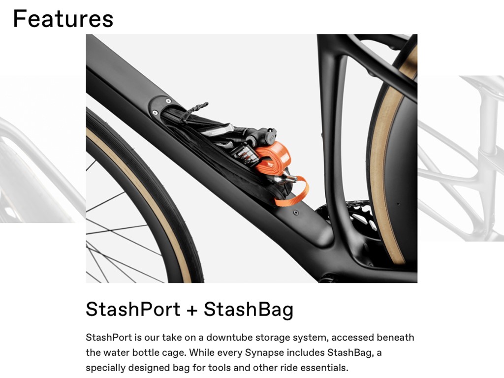 - Lightweight, smoothly compliant, sleekly aero Synapse carbon frameset with StashPort downtube storage