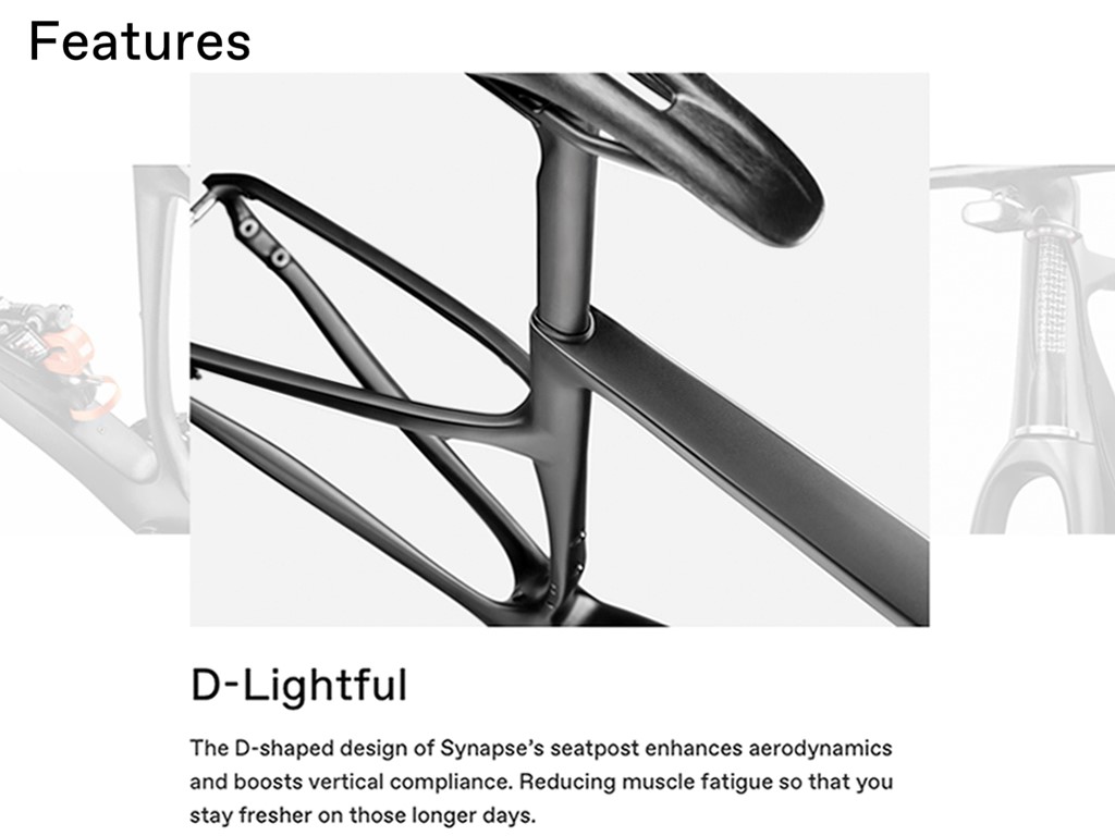 With advancements in our carbon layup, our engineers have made the new Synapse 20% more compliant than its already butter-smooth predecessor, ensuring you feel 100% more comfortable even on the roughest roads.