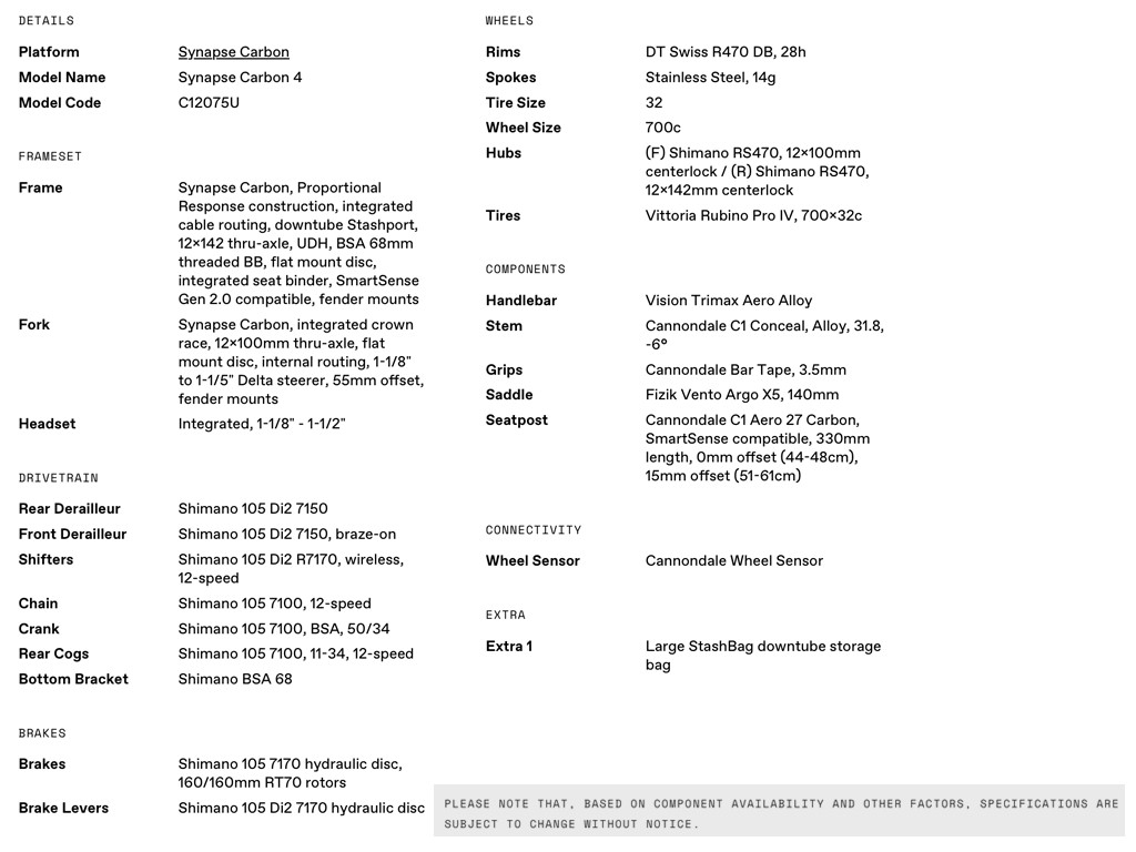 - Lightweight, smoothly compliant, sleekly aero Synapse carbon frameset with StashPort downtube storage