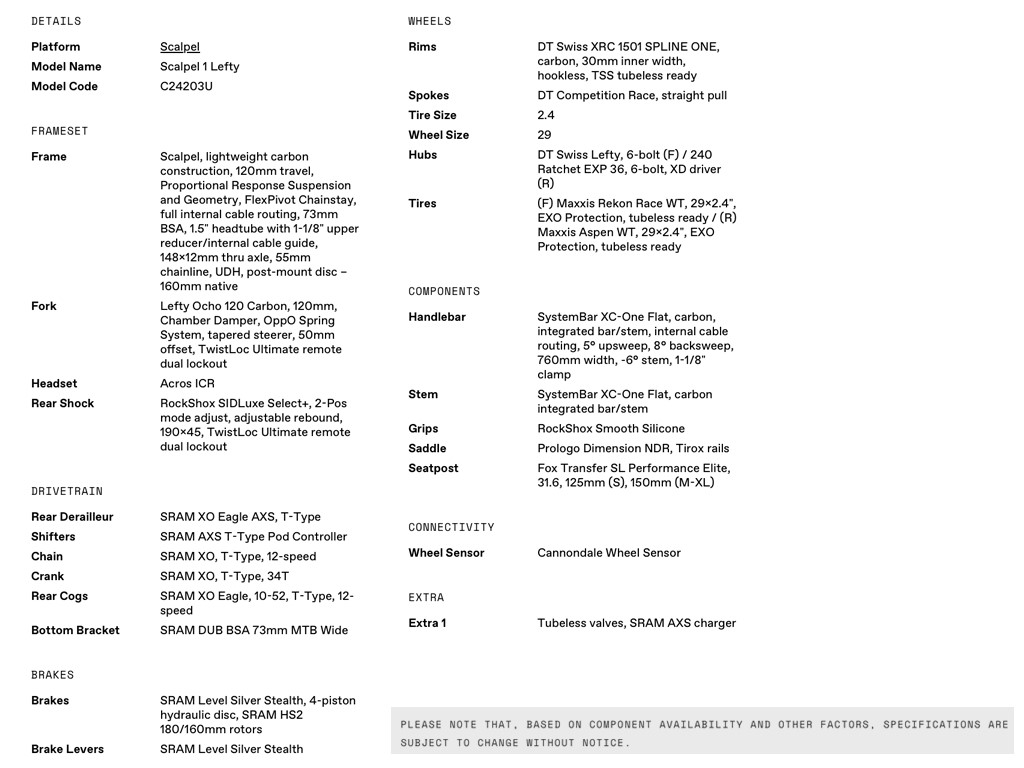 CANNONDALE 2024 29U SCALPEL CARBON 1 MOUNTAIN BIKE
