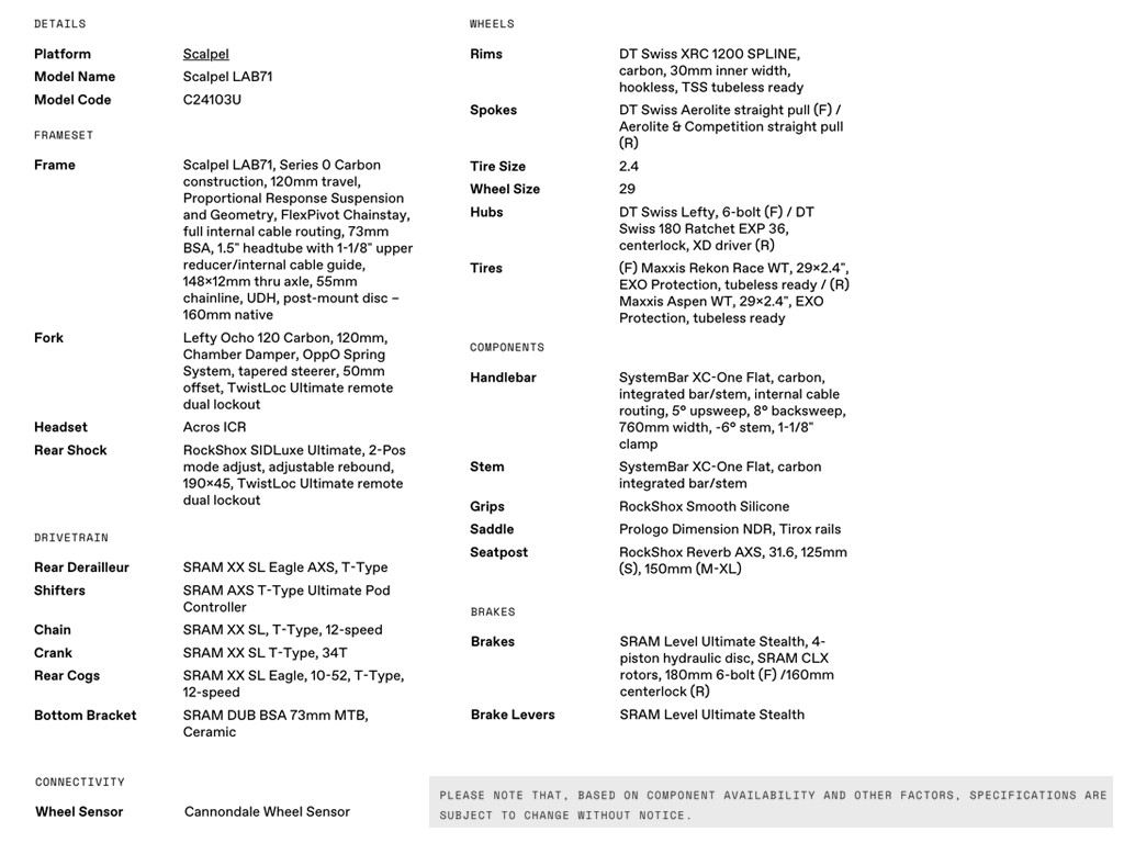 CANNONDALE 2024 29U SCALPEL LAB71 MOUNTAIN BIKE