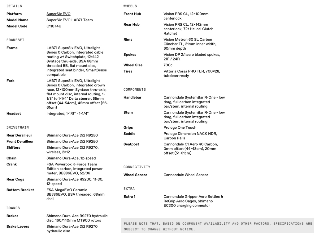 There are “team edition” bikes – with little more than pro paint and decals – and then there are real, 100%-team-spec, pro-ridden race bikes, like this replica of the LAB71 SuperSix EVO piloted by EF Education First–EasyPost and EF Education First–Cannondale. It’s a true pro machine, built on an ultra-light Series 0 carbon construction frame, with Shimano Dura-Ace Di2, an FSA PowerBox power meter, our SystemBar R-One one-piece carbon cockpit, and Vision Metron 60 SL wheels.
