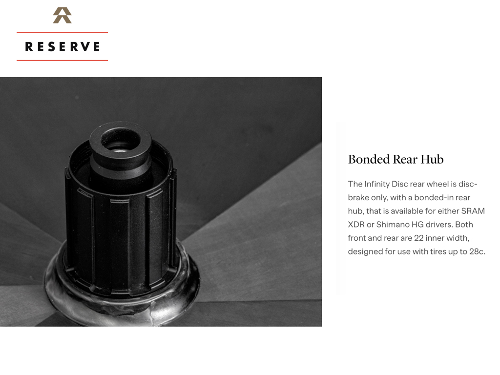 The Infinity Disc rear wheel is disc-brake only, with a bonded-in rear hub, that is available for either SRAM XDR or Shimano HG drivers. Both front and rear are 22 inner width, designed for use with tires up to 28c.
