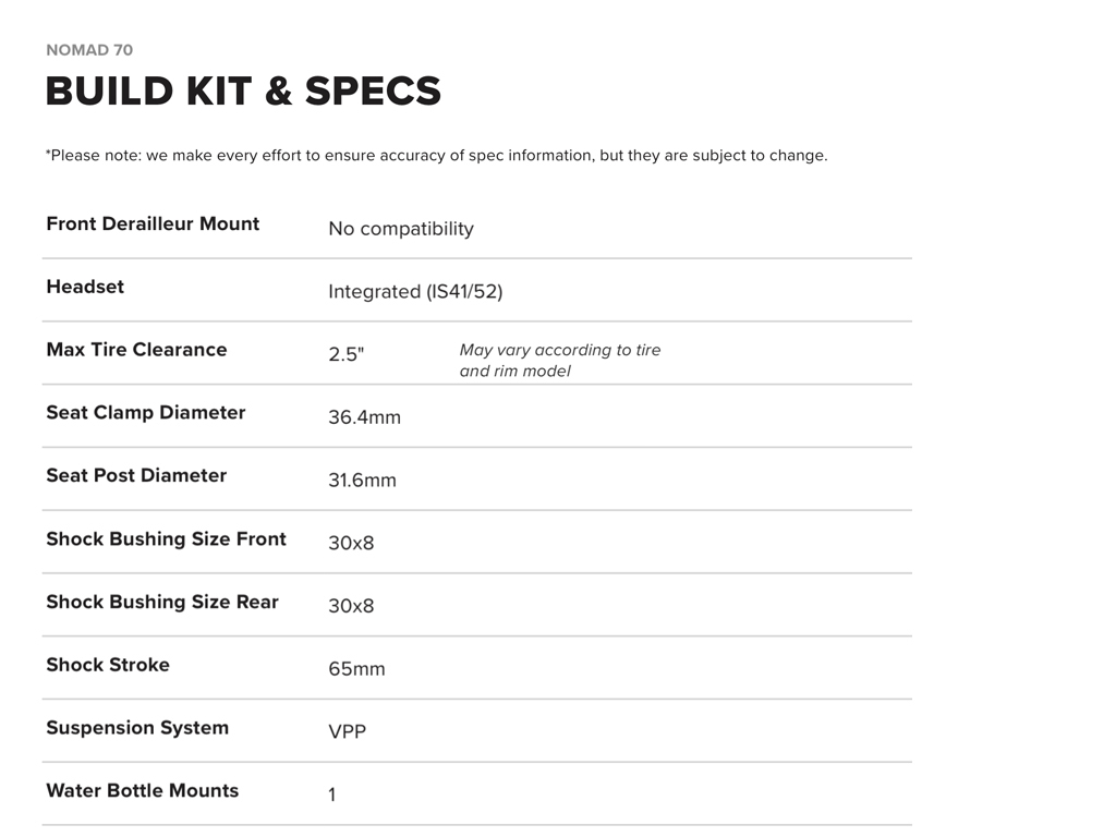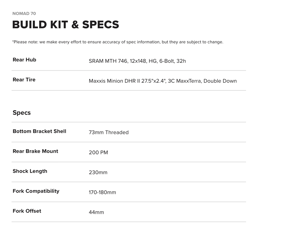 Base model with same tires and big rotors as all Nomads. SRAM 70 cable actuated T-Type Transmission, FOX Float X rear shock, and Reserve AL rims.
