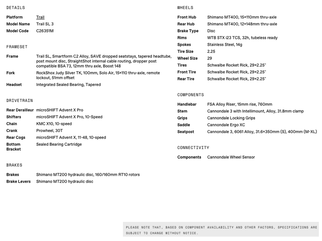 CANNONDALE 2023 29M TRAIL SL 3 MOUNTAIN BIKE