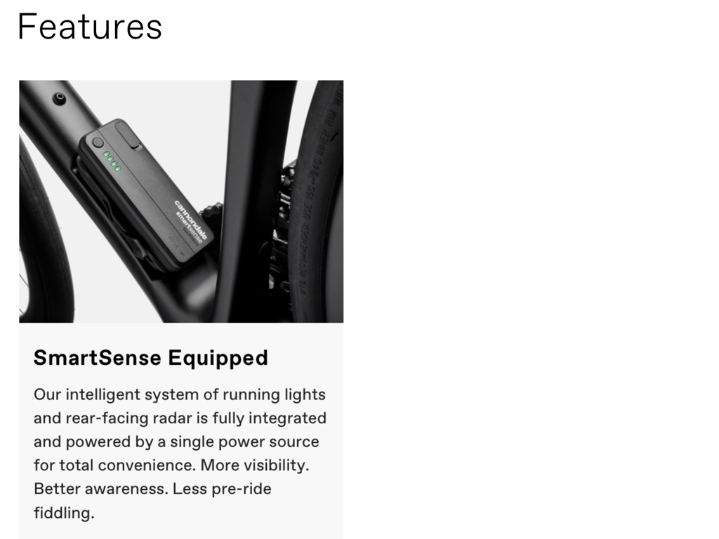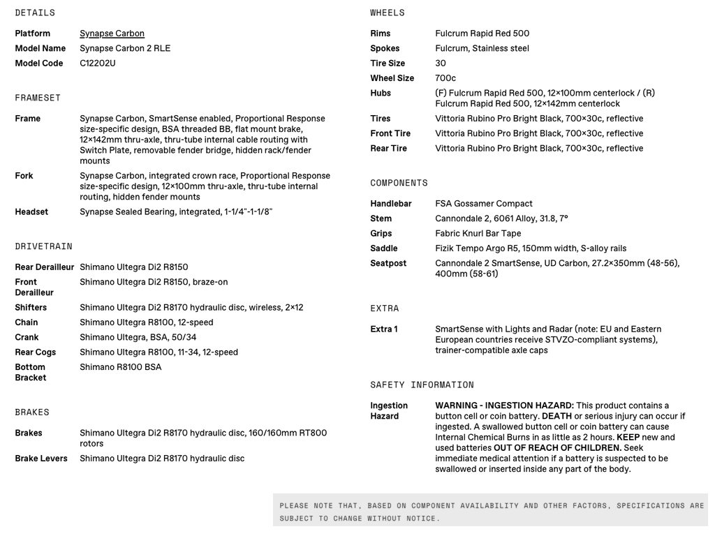 - Lightweight Synapse Carbon Frameset / Full SmartSense system with radar and lights