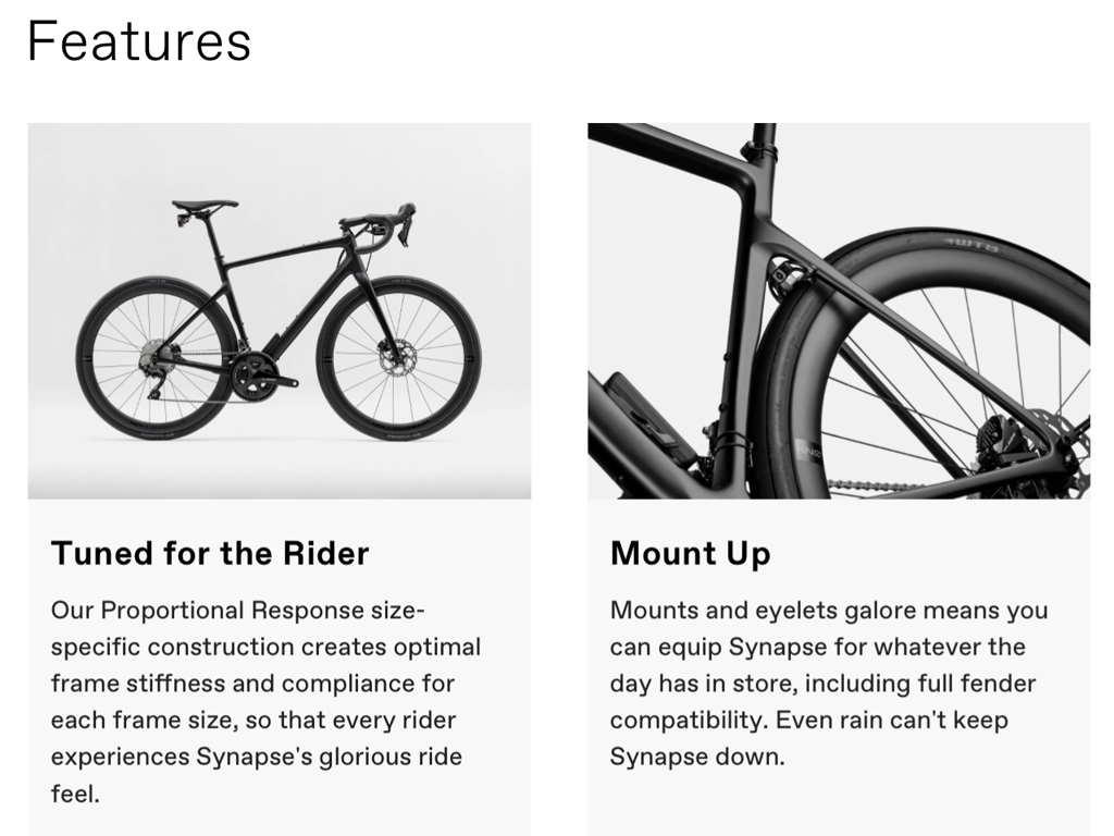 With a comfortably balanced riding position, confidence-inspiring handling, room for 35mm wide tires for cushion and grip, and plenty of gear/bottle mounts, Synapse is ready to rock on any road, anywhere.