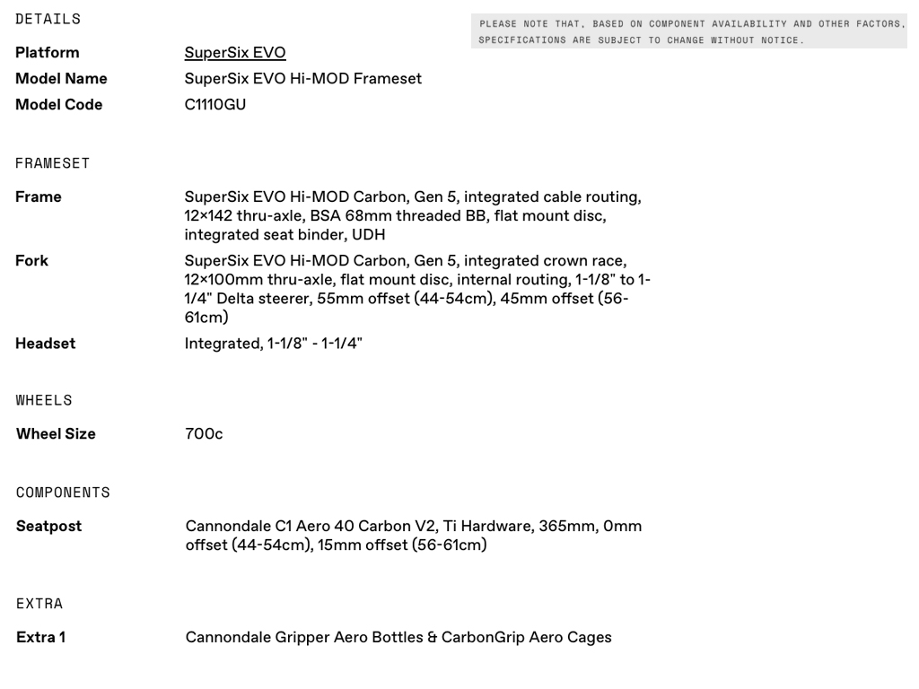 - Superlight, low drag Gen 5 SuperSix EVO frame. Hi-MOD carbon construction - incredibly light and responsive