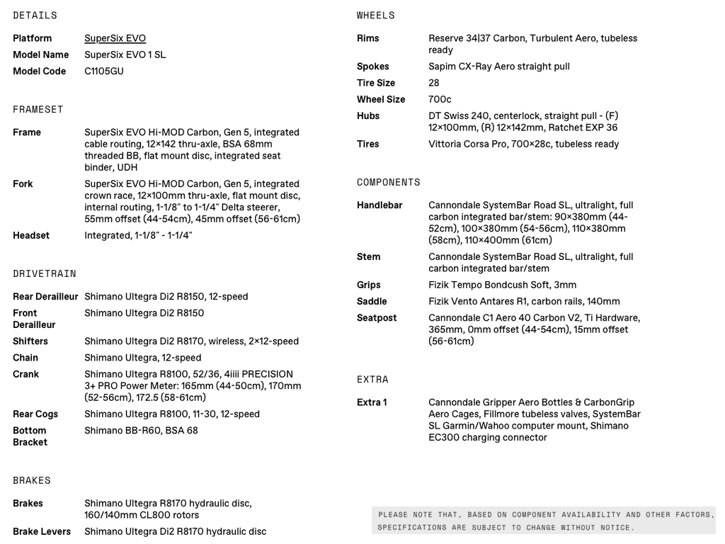 - Superlight, low drag Gen 5 SuperSix EVO frameset. Hi-MOD carbon construction - incredibly light and responsive