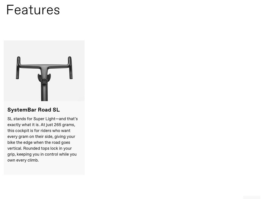 - Cannondale SystemBar Road SL - ultralight, full carbon integrated bar/stem for pinpoint control and maximum weight savings