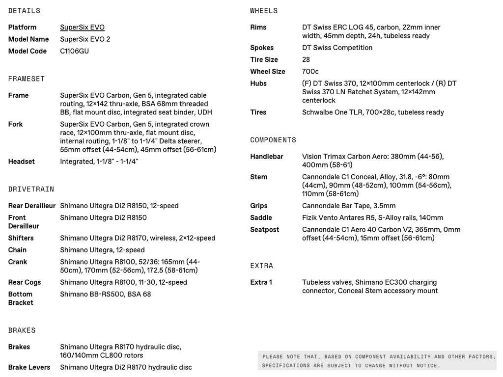 - Lightweight, low-drag Gen 5 SuperSix EVO carbon frameset – the ideal blend of speed, handling and comfort