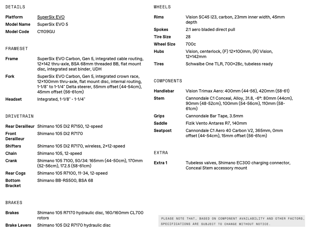 - Lightweight, low-drag Gen 5 SuperSix EVO carbon frameset – the ideal blend of speed, handling and comfort
