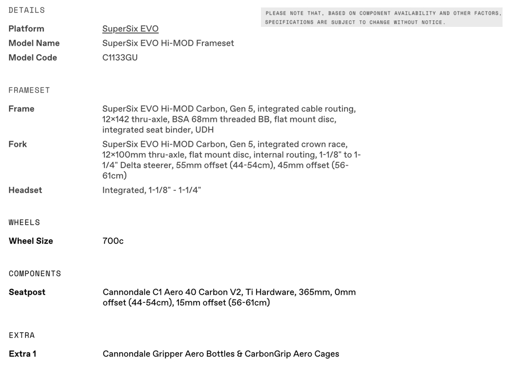 - Superlight, low drag Gen 5 SuperSix EVO frame. Hi-MOD carbon construction - incredibly light and responsive