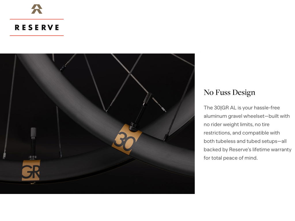 The 30|GR AL is your hassle-free aluminum gravel wheelset—built with no rider weight limits, no tire restrictions, and compatible with both tubeless and tubed setups—all backed by Reserve’s lifetime warranty for total peace of mind.