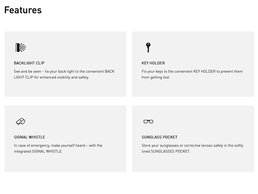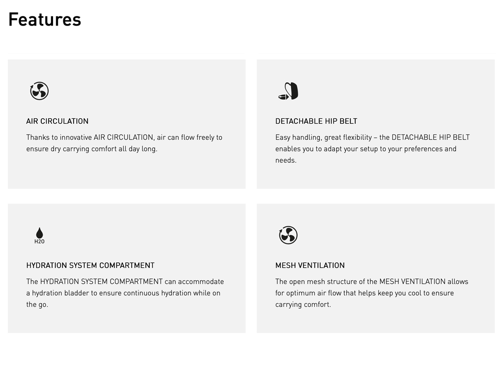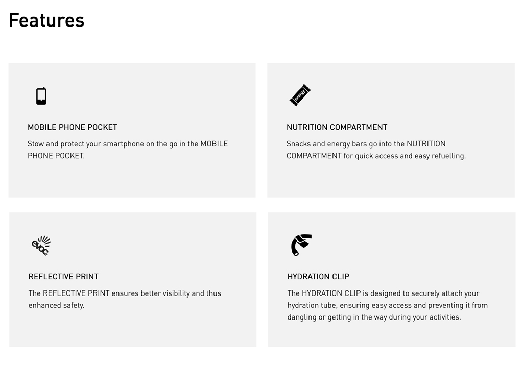 - Hydration system compartment for bladders up to 2L capacity (Hydration bladder is not included)