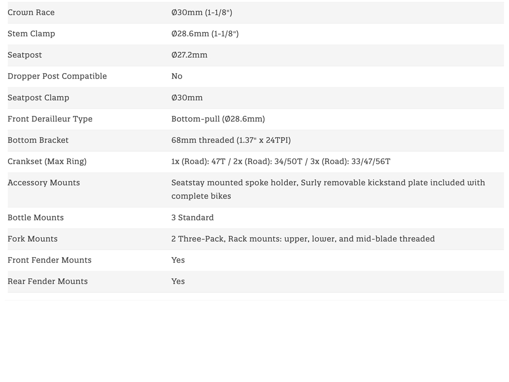 - Dynamo routing on the fork, plus three-pack mounts on the blade and every braze-on you’ll ever need for racks, fenders, water bottle cages, and more