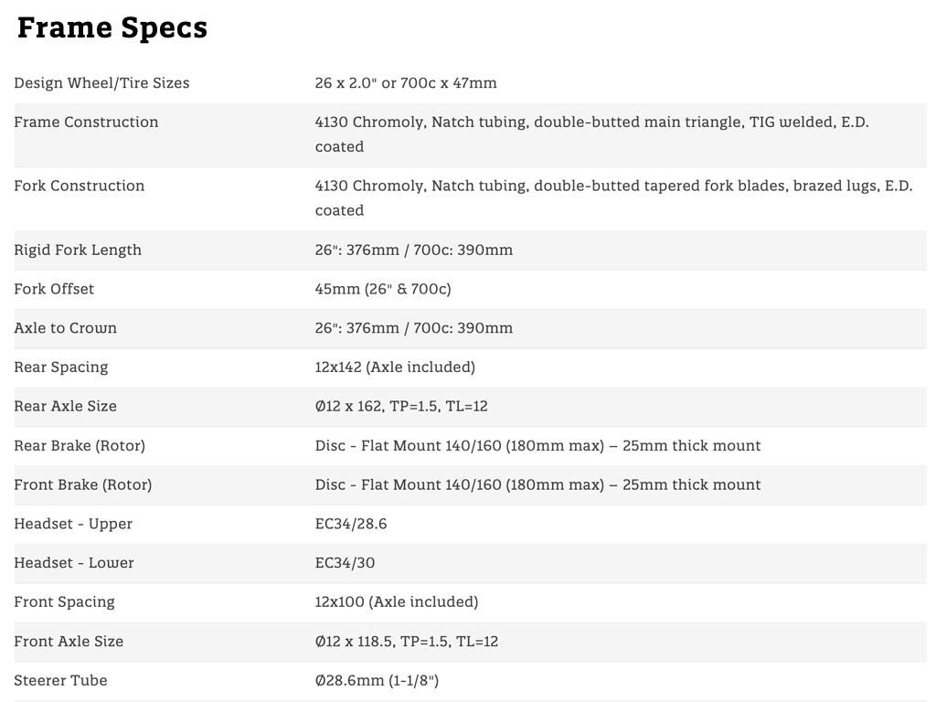 - Clearance for 26” x 2.1” tires with or without fenders, or 700c x 47mm with or without fenders